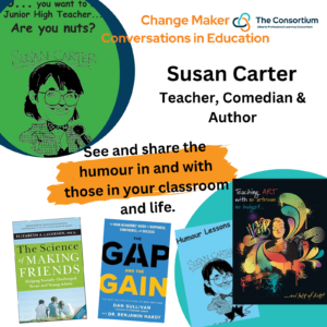 In this episode, we visit with retired teacher Susan Carter, who, while teaching, branched out into stand-up comedy, starting at Yuk Yuks and carrying on to Churches, Community Events, and Teachers’ Conventions. Susan has self-published a number of books. We talk about that process, her thoughts about the importance of comedy in the classroom and life, at least in part from her own experience, to “survive” and we might add thrive in the entertaining “chaos” that can be the Junior High experience.