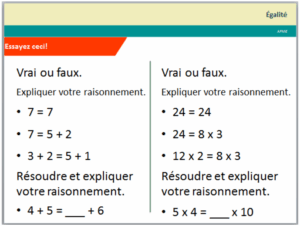 Les activités suivantes font parties du webinaire provincial sur la égalité. On vous suggère de choisir une ou plusieurs de ces activités et de les administrer à vos élèves. Vous pourrez alors attester des succès de vos élèves. Est-ce qu’ils ont une compréhension opérationnelle ou relationnelle de l’égalité?